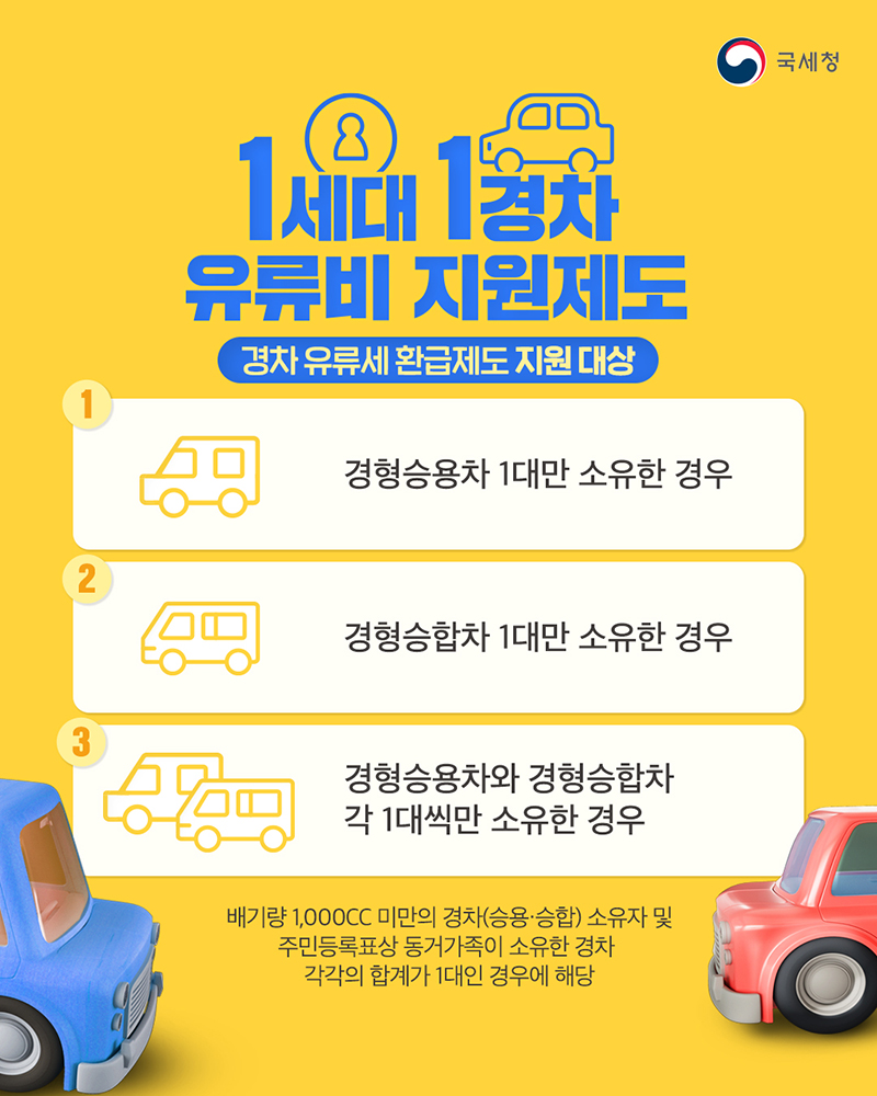 - 가구당 소유 요건: 주민등록상 1세대당 경형 승용차 또는 경형 승합차 각각 1대씩 소유한 경우.